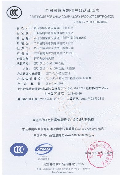 熱烈慶祝鶴山市恒保防火玻璃廠(chǎng)有限公司取得3C防火窗證!