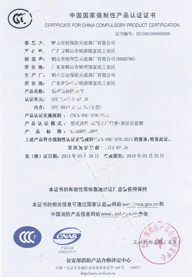 鶴山市恒保防火玻璃廠(chǎng)有限公司在陳總經(jīng)理的領(lǐng)導(dǎo)下,跟全體員工的共同努力下,于2013年3月18日通過(guò)國(guó)家防火建筑材料質(zhì)量監(jiān)督檢驗(yàn)中心的檢測(cè),最終通過(guò)由公安部消防產(chǎn)品合格評(píng)定