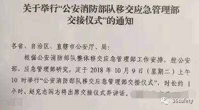 據(jù)多家媒體披露,根據(jù)公安消防部隊(duì)整體移交應(yīng)急管理部工作安排,經(jīng)應(yīng)急管理部、公安部部門(mén)研究,定于2018年10月9日(周二)上午10時(shí)舉行“公安消防部隊(duì)移交應(yīng)急管理部交接儀式”,時(shí)長(zhǎng)約1小時(shí),公安部部長(zhǎng)趙克志將出席交接儀式并講話(huà),主會(huì)場(chǎng)設(shè)在公安部機(jī)關(guān)樓。