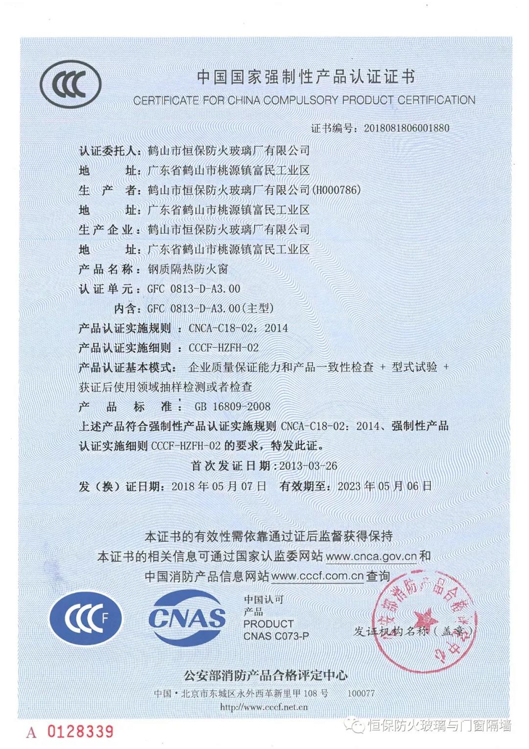 截止2018年10月,已獲得國(guó)家“CCCf”主型產(chǎn)品認(rèn)證證書(shū)36張,評(píng)定中心網(wǎng)上公告報(bào)告55份,四川中心公告26份,天津中心公告2份,英標(biāo)、歐標(biāo)、澳標(biāo)、美標(biāo)檢驗(yàn)報(bào)告35份評(píng)估報(bào)告20份,耐火窗等其他性能測(cè)試報(bào)告16份,恒保公司共獲報(bào)告154份涵蓋0.5小時(shí)至4小時(shí)防火系列產(chǎn)品,并擁有防火玻璃與門(mén)窗類(lèi)專(zhuān)利21項(xiàng)。