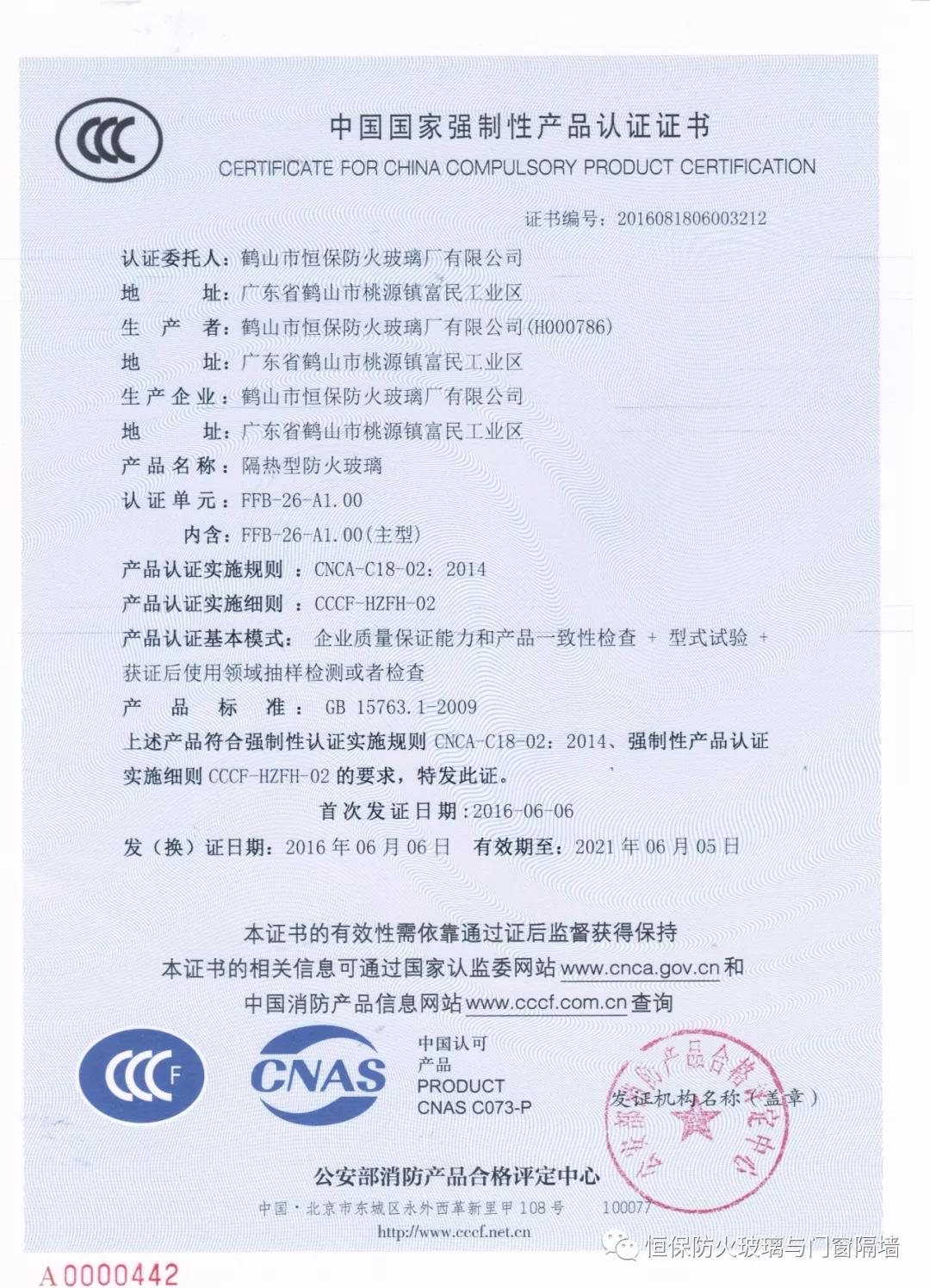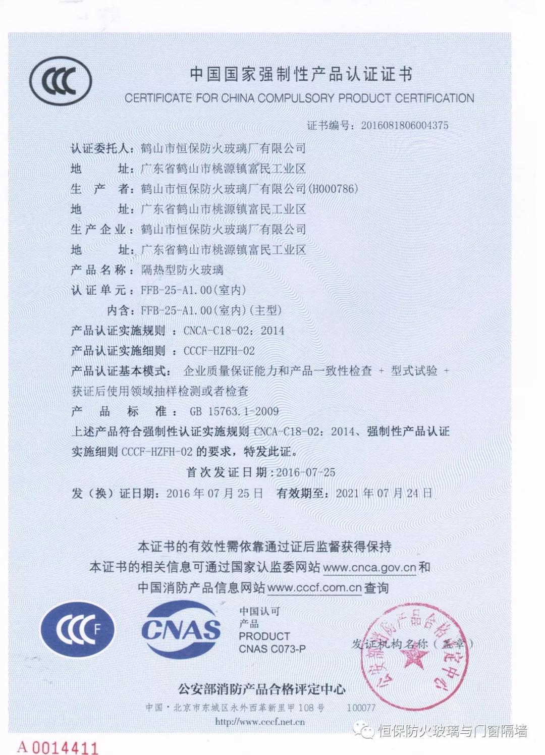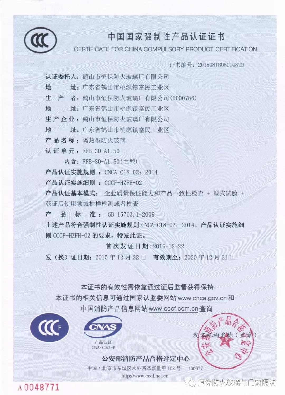 截至2017年7月,恒保已獲得國家“CCCf” 主型產品認證證書31張,評定中心網(wǎng)上公告報告51份,四川中心公告11份,英標、歐標、澳標、美標報告29份評估報告18份,耐火窗報告4份,共計113份涵蓋0.5小時至4小時防火玻璃系列產品,防火玻璃與門窗類專利17項。