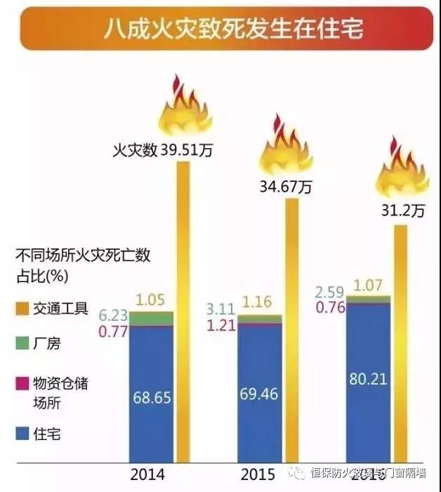 近十年全國(guó)共發(fā)生高層建筑火災(zāi)3.1萬起,死亡474人,直接財(cái)產(chǎn)損失15.6億元。近三年來,火災(zāi)致死發(fā)生在住宅的比例逐年升高,2016年有1269人在住宅火災(zāi)中死亡,占火災(zāi)致死總數(shù)的80.21%。
